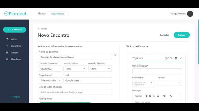 Após preencher as informações do encontro como nome, dia e hora, local... Você pode dividir as pautas do seu encontro em tópicos, assim, deixando os assuntos a serem debatidos mais organizados. Na parte direita da tela é possível adicionar as informações do tópico como, nome, tempo do tópico, o responsável por falar a respeito daquele tópico, adicionar uma descrição do que seria debatido naquele tópico, adicionar um anexo àquele tópico para todos os participantes terem acesso e também incluir tags para atribuir categorias para os tópicos. O Plameet não tem limite de tópicos, então fique à vontade para adicionar quantos achar necessário. Após incluir todas as informações é só clicar no botão 'Salvar' para salvar o seu novo encontro.