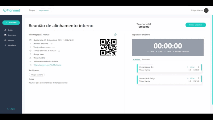 No Plameet é possível você ter o controle de vários tipos de tempos como o tempo total do encontro, tempo estimado e tempo de cada tópico. Além disso, você também tem a informação da hora exata que o encontro deu início (que é gravado assim que o mediador clicar no botão de iniciar encontro) e também a hora exata em que se encerrou o encontro (que é gravado assim que o mediador clica no botão de encerrar encontro), fazendo com que você tenha uma análise completa do andamento do seu encontro.