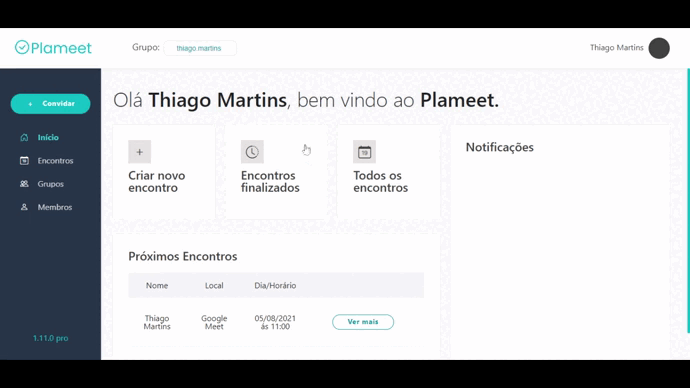 Existem duas formas de criar um novo encontro no Plameet. A primeira forma é na página Início, clicando no botão 'Criar novo encontro'. Outra maneira de criar um novo encontro é na página 'Encontros' clicando no botão 'Novo encontro' localizado na parte superior direta da tela. As duas formas são apresentadas no vídeo abaixo.